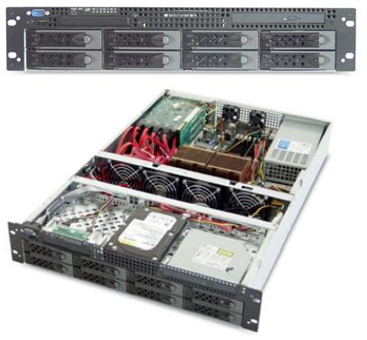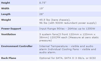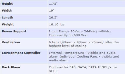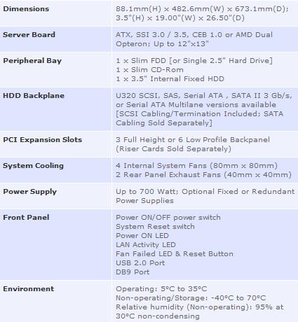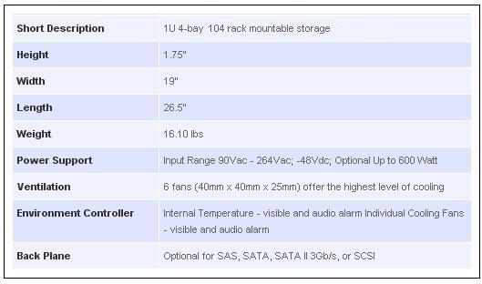 The 1U 4-bay rack mountable high-density server enclosure is designed for implementing NAS or high availability storage subsystem and supports up to four hot-swappable hard disk drives in SCSI, SAS, SATA, or SATA II 3 Gb/s interface. The server model allows support for a SSI 3.0 / 3.5, CEB 1.0 or AMD Dual Opteron compliant server board 12.0" x 13.0" in size. The storage model allows support for an internal mount storage controller or external mount 5 1/4" RAID, NAS, or DAS controller.